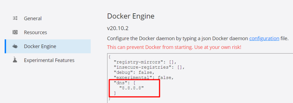Open Docker Settings and add “dns” as below. It will help to resolve some network issues. Restarting Docker is required.