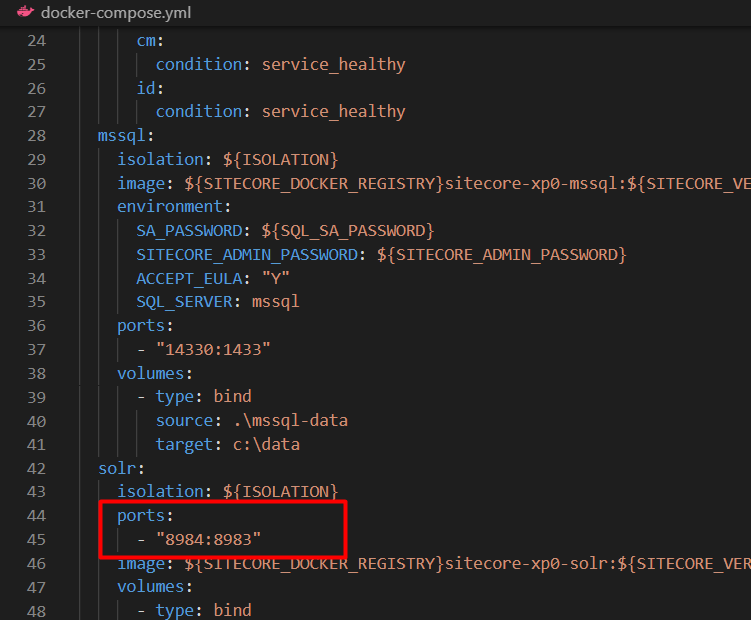 We should ensure that the port 8984 available and is not being used by another processes. If we look at how Solr is defined in the docker-compose.yml file, we will see that the port is setup to map to 8984 on your local machine to 8983 on the running Solr container.