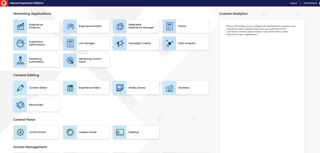 Browse to https://xp0cm.localhost/sitecore and using “admin” for the username and the password in the .env file (“Password12345” by default in init.ps1) to login. Now, we have Sitecore 10.1 running on Docker. With Sitecore 10.1, Sitecore Launchpad has new design. It’s very cool 😊.